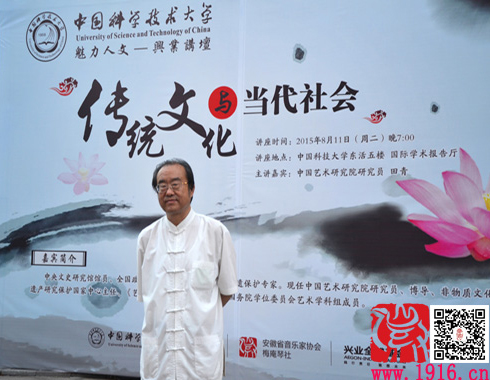 【编者按】201581115日,清音徽风——查阜西先生诞辰120周年暨丽田生琴台考12周年纪念系列活动在安徽合肥与黄山等地举办。作为本次系列活动之一,811日晚,田青先生在中国科学技术大学举办一场题为中国传统文化与当代社会的报告会。讲座安排在暑假期间,这在中科大历史上是第一次。原本以为师生放假、听众很少,但出乎预料的是整场讲座从头至尾座无虚席,很多听众站立旁听。现场气氛热烈,两个小时,中间没有休息,大家仍觉时间太短,很多问题不能一一向大师请教。
