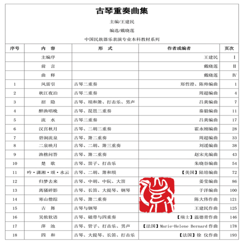 本曲集作为上海音乐学院民族音乐系专业学习重奏教材,在学生的古琴重奏课“琴箫重奏”中已使用多年,通过几年的实践,在训练上也取得了一定的教学效果。希望今后在不断的实践中,以本曲集为契机继续总结经验,完善和丰富古琴的重奏曲目,推动古琴音乐及学科的发展。在此希望得到同行、学者、习琴者的批评指正。