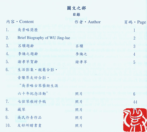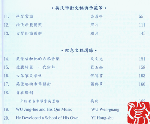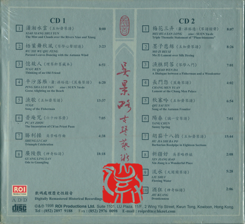 此专辑收录了吴氏的18首精选录音,部份是永不复得而至为珍贵的实况演奏,并随图文集附录了吴氏至为重要的著作《学琴常识》和指法示范围照数十帧,以便古琴爱好者能详加欣赏、学习及研究。